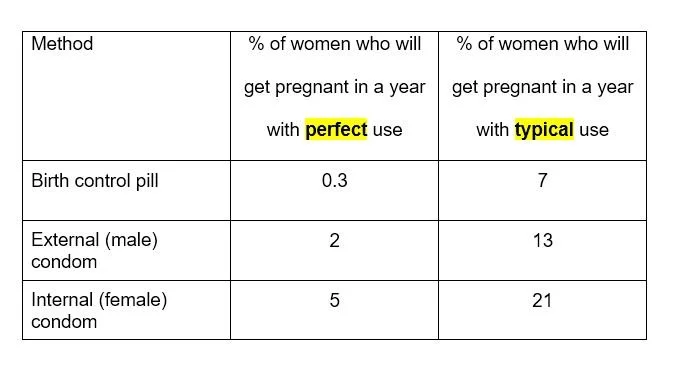 So when we look at what we call typical use, 7 out of 100 pill users will get pregnant in a year. It almost doubles for the external condom. 13 people will get pregnant in a year with typical use of the external condom. And with the internal condom, 21 women will get pregnant in a year of using it as their only method of contraception.